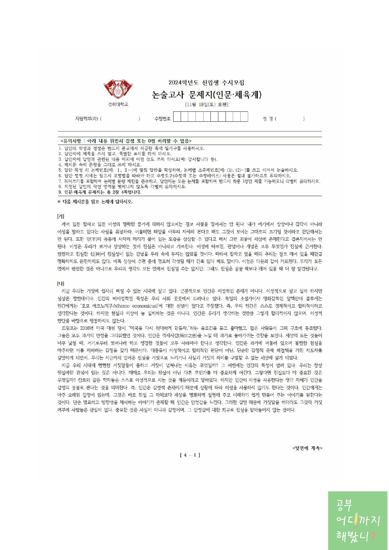 2024학년도 신입생 수시모집 논술고사 문제지(인문·체육계)