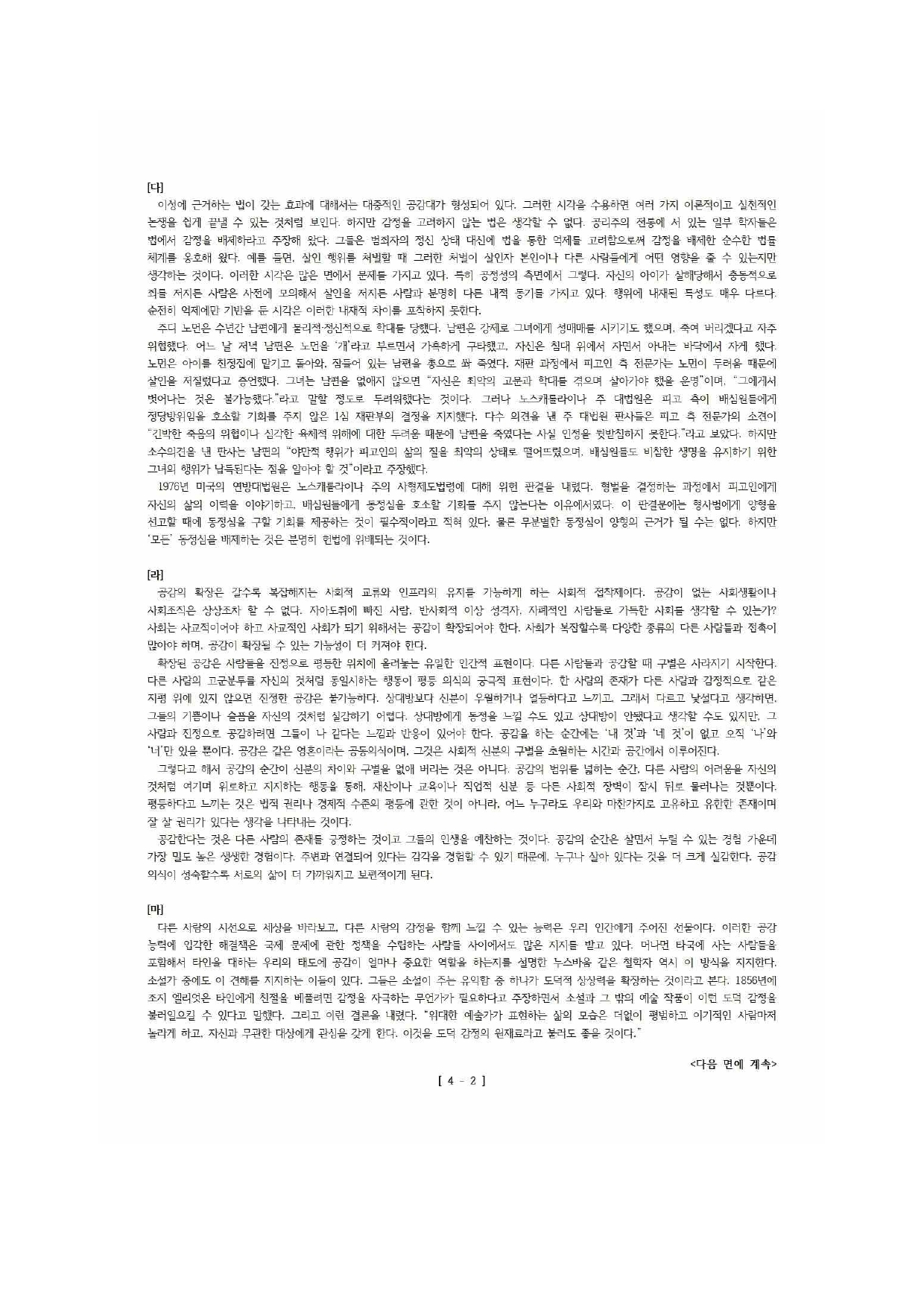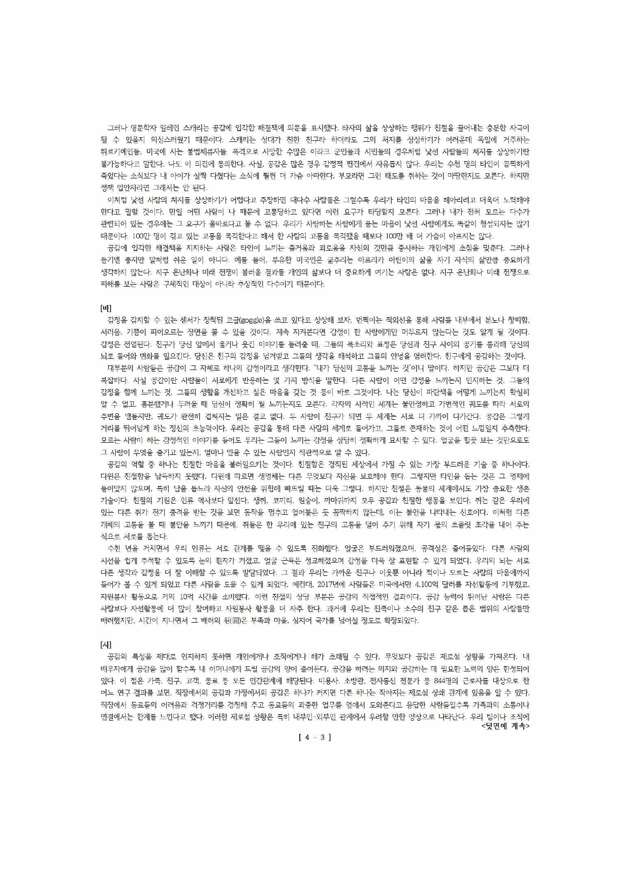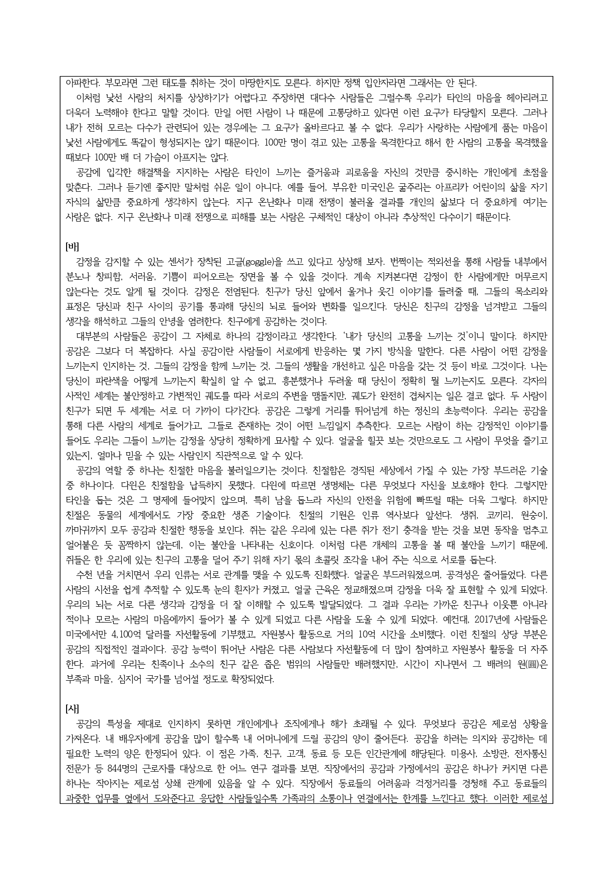 한편 [바]는 공감의 가치를 감정의 영역에서 찾는다. 공감은 사람들 간의 거리를 뛰어넘게 하는 정신의 초능력으로서, 우리는 공감을 통해 다른 사람의 세계를 느낄 수 있다. 이러한 감정의 전염은 친절한 마음을 확산시킴으로써, 인류와 동물이 사회성을 획득하는 방향으로 진화할 수 있게 해주는 원동력이라는 것이다. 하지만 이러한 주장은 [마],[사]의 입장에서 받아들일 수 없다. 인간의 감정적 자원은 제한적이기 때문에, 경계와 집단을 초월해 모든 사람들에게 공감할 수 있다는 것은 지나치게 이상적인 생각이다. (1,062자)