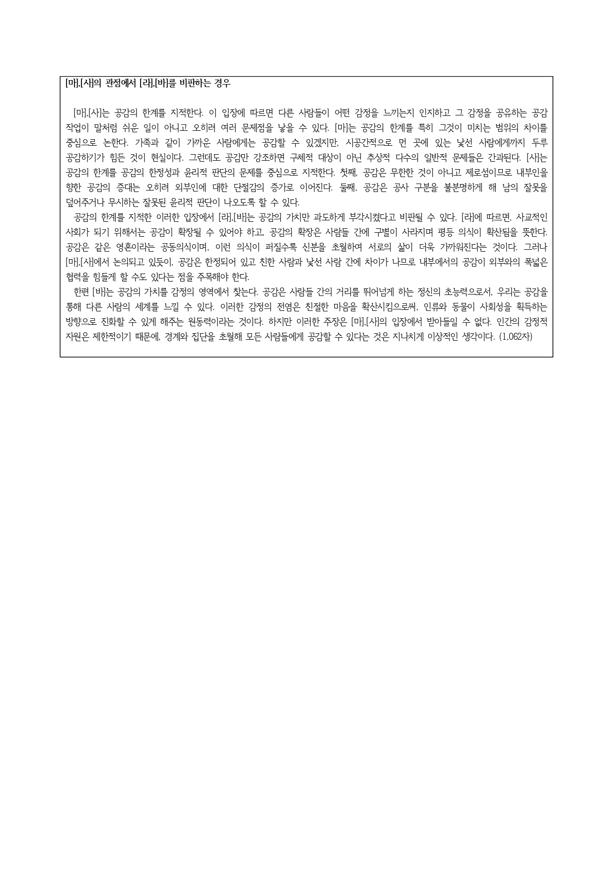 한편 [사]는 공감의 한계를 두 가지로 지적한다. 첫째, 공감은 제로섬 상황을 가져오고 특히 내부인을 향한 공감이 외부인과의 단절감을 증가시킨다. 둘째, 공감은 공사 구분을 불분명하게 해 잘못된 윤리적 판단이 나오도록 할 수 있다. 하지만 이러한 주장은 [라],[바]의 입장에서 받아들일 수 없다. 진정한 공감은 제로섬이 아니고 모든 감정의 전염이 그렇듯이 하면 할수록 커질 수 있다는 점을 주목해야 한다. 또한 공사 구분을 못 해 윤리적 문제를 일으키는 집단 충성심이나 그로 인해 발생하는 부정부패는 공감과 다른 문제이다. (1,083자)
