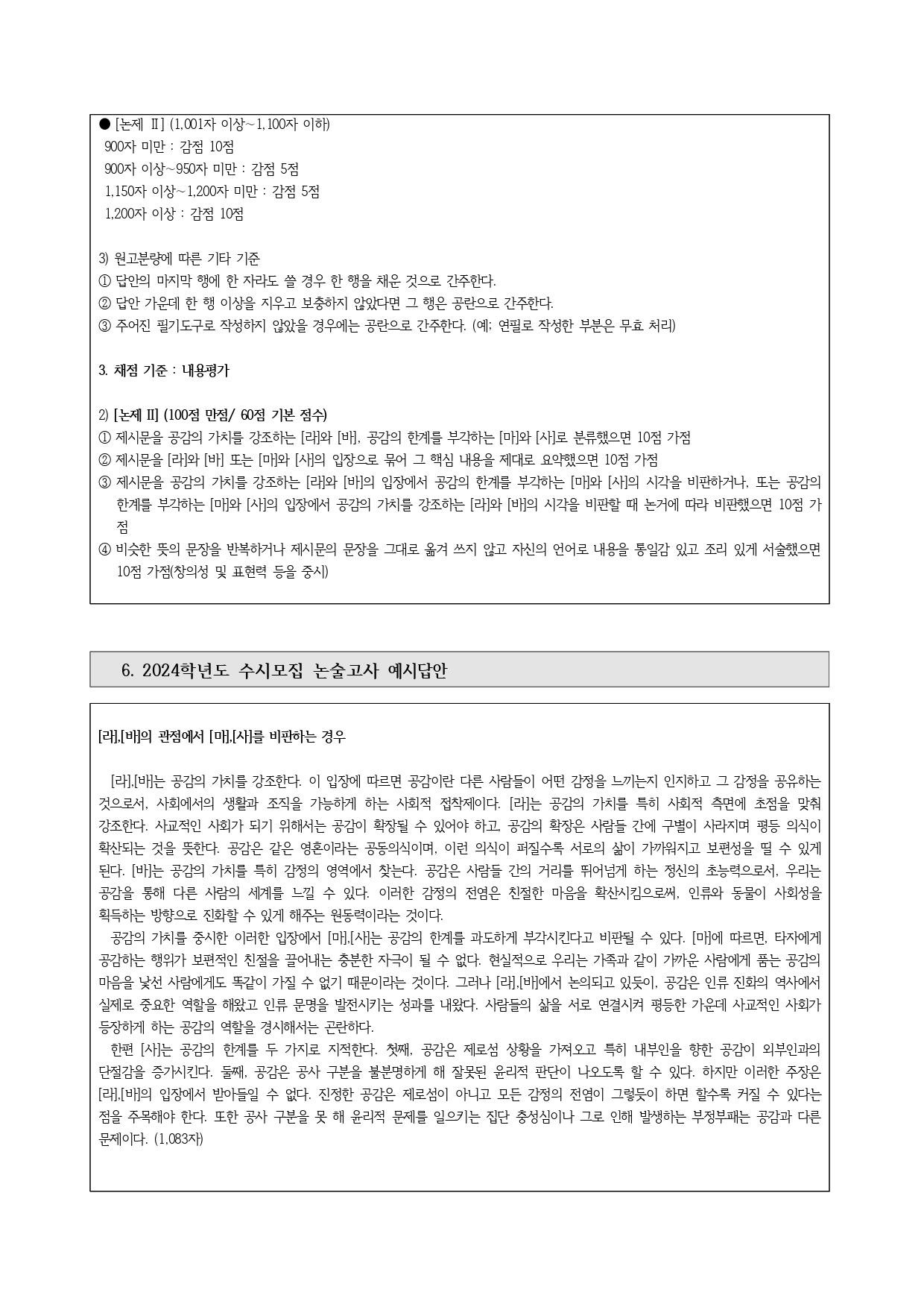 ③ 제시문을 공감의 가치를 강조하는 [라]와 [바]의 입장에서 공감의 한계를 부각하는 [마]와 [사]의 시각을 비판하거나, 또는 공감의 한계를 부각하는 [마]와 [사]의 입장에서 공감의 가치를 강조하는 [라]와 [바]의 시각을 비판할 때 논거에 따라 비판했으면 10점 가점④ 비슷한 뜻의 문장을 반복하거나 제시문의 문장을 그대로 옮겨 쓰지 않고 자신의 언어로 내용을 통일감 있고 조리 있게 서술했으면 10점 가점(창의성 및 표현력 등을 중시)